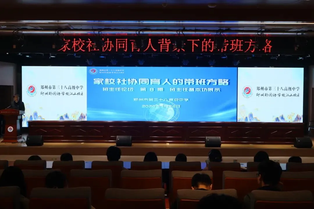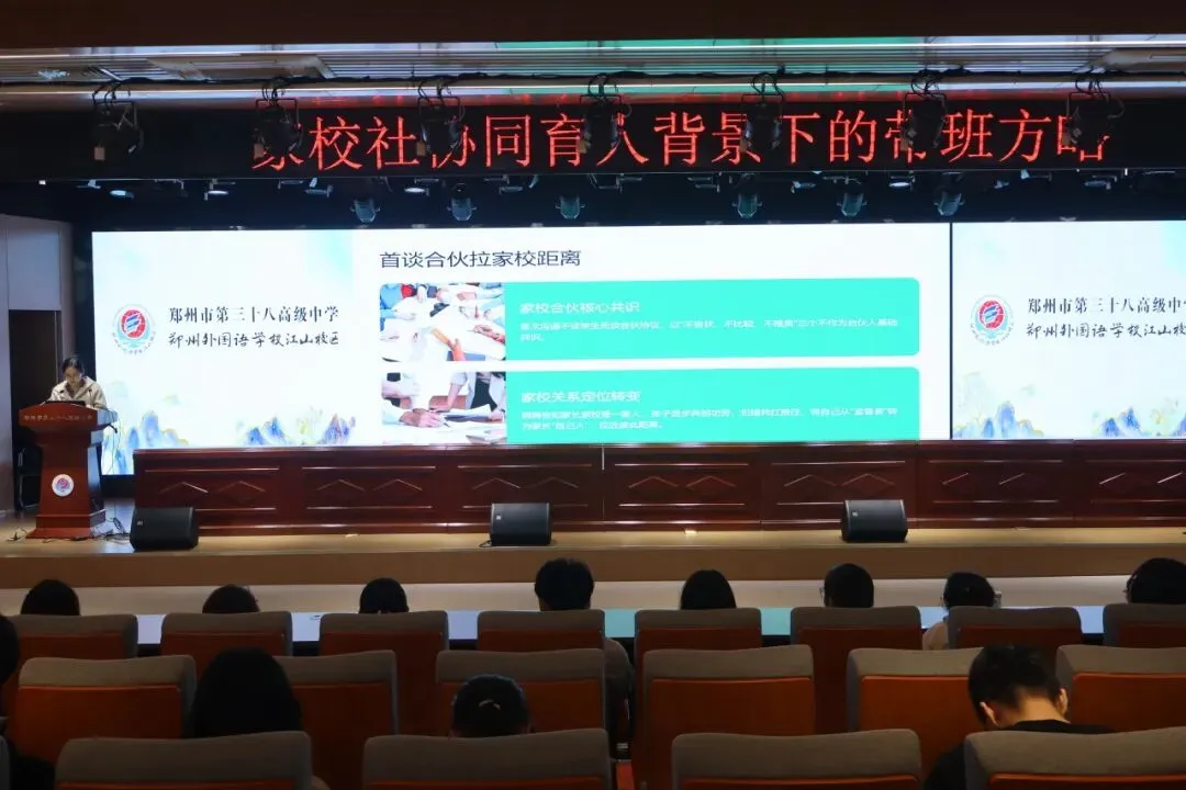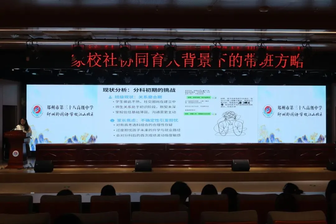 春光明媚,研思正浓。3月24日下午,郑州市第三十八高级中学第八期班主任论坛在学术报告厅如期举行。副校长何冰艳、德育处主任张艳奎、教务处主任孙新广与全体班主任、副班主任及实习老师齐聚一堂,围绕“家校社协同育人的带班方略”这一主题,共享沟通智慧,共探育人新径。