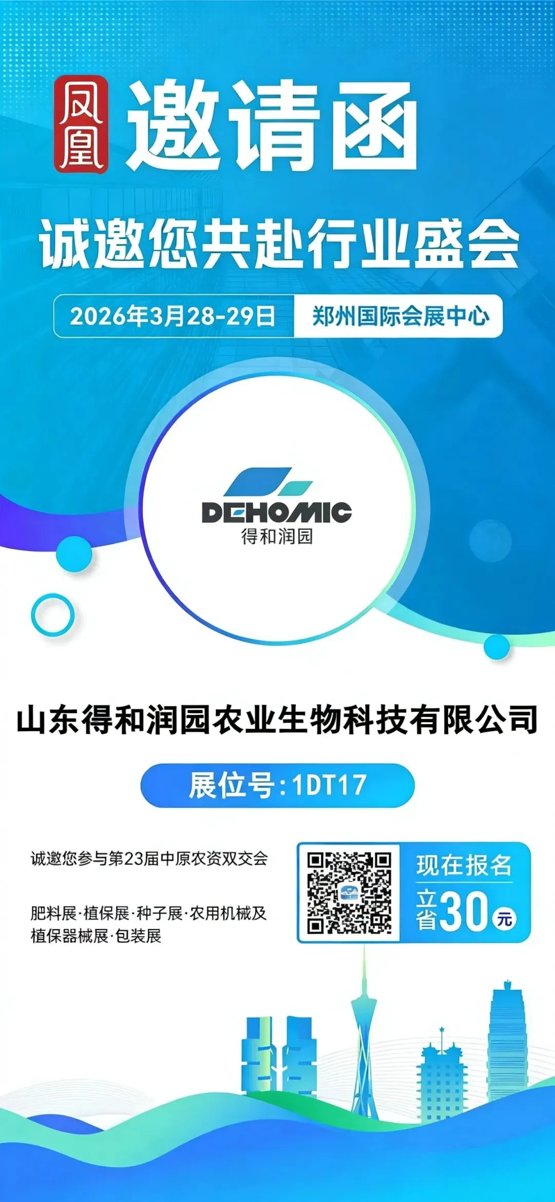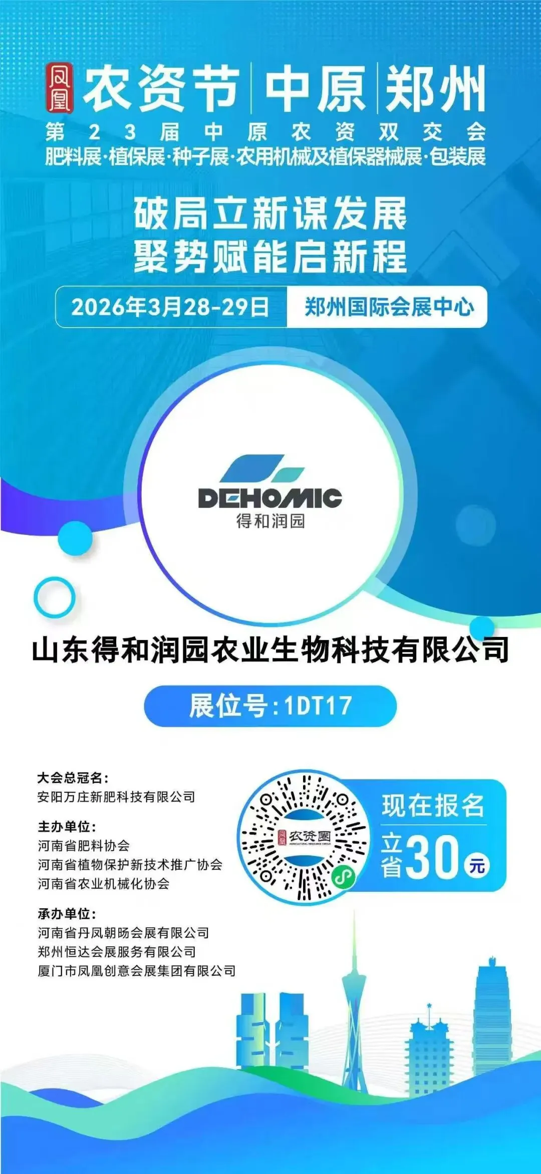 春启中原,植保焕新!2026年3月28-29日,第23届中原农资双交会(郑州植保会)将在郑州国际会展中心盛大启幕!作为深耕农业生物科技领域的标杆企业,山东得和润园农业生物科技有限公司携核心爆品强势入驻,展位号1DT17!以河南人的热情与专业,诚邀全国农资人莅临品鉴,共探土壤改良新路径,解锁作物高产优质密码!