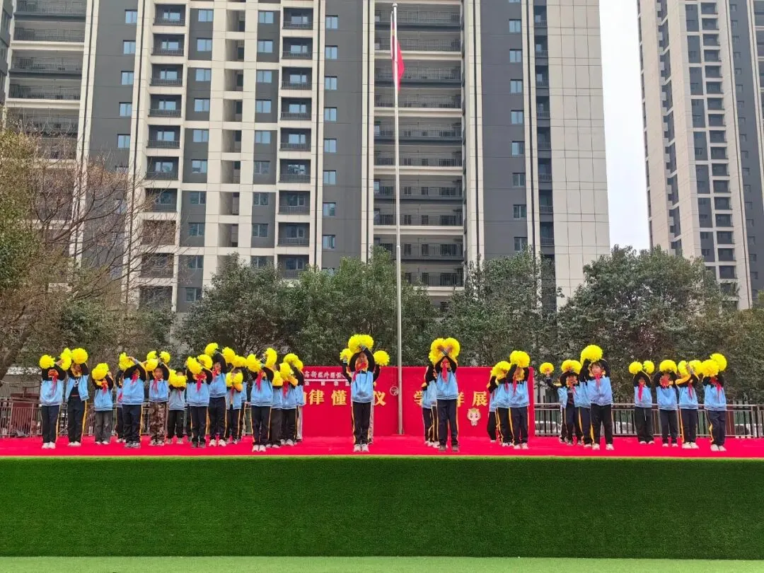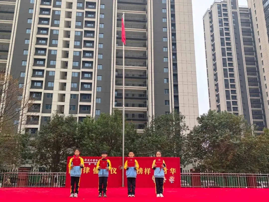 伴随着激昂的出旗曲,旗手们迈着整齐有力的步伐护送五星红旗走向升旗台。全体师生肃立注目,高唱国歌,五星红旗冉冉升起,迎风舒展,嘹亮的歌声在校园上空回荡,爱国情怀与成长信念在每个人心中激荡。