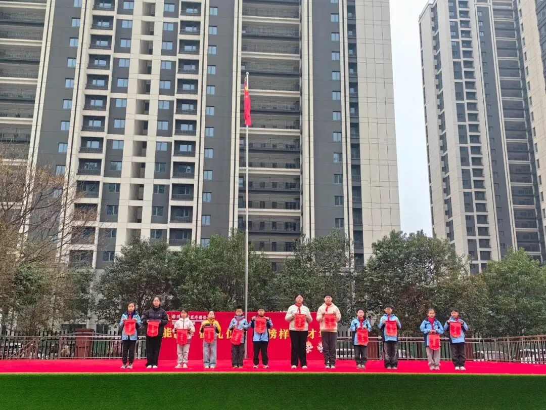 仪式最后,大队干部刘雨冉宣读上周纪律卫生检查评比结果:三二班、三一班、五四班、二四班、二三班、四四班、一五班、三三班、六三班、二二班、六一班、六二班,荣获本周五星流动红旗班级。