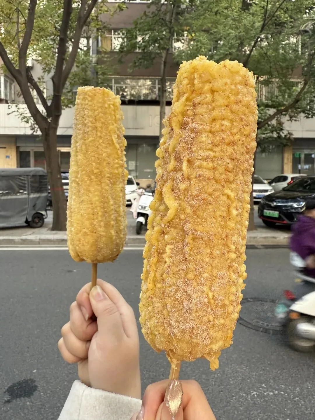 外边的脆壳香酥掉渣,配着玉米的清甜,越嚼越带劲,我这根还撒了点香辣粉,微微的咸香带点辣,太上头了。