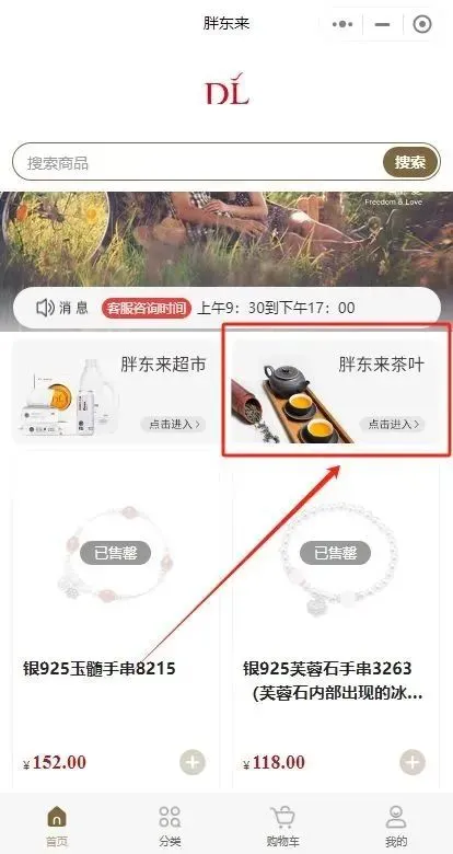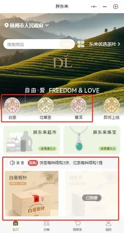1.进入胖东来线上商城微信小程序,可以点击页面中间的“胖东来茶叶”,切换到东来优选茶叶购买页面。