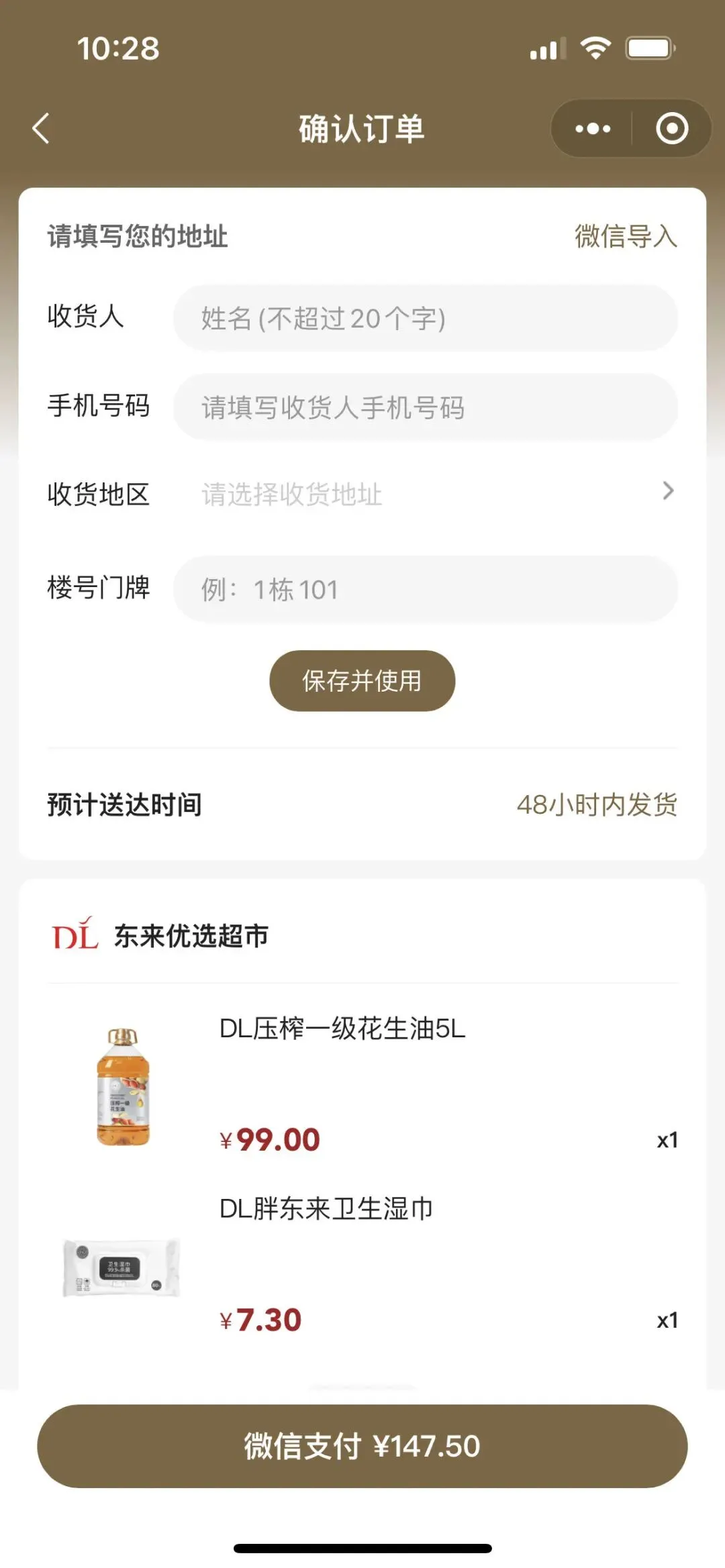 3、填写您的收货人和收货地址信息点击「保存并使用」后支付即下单成功。