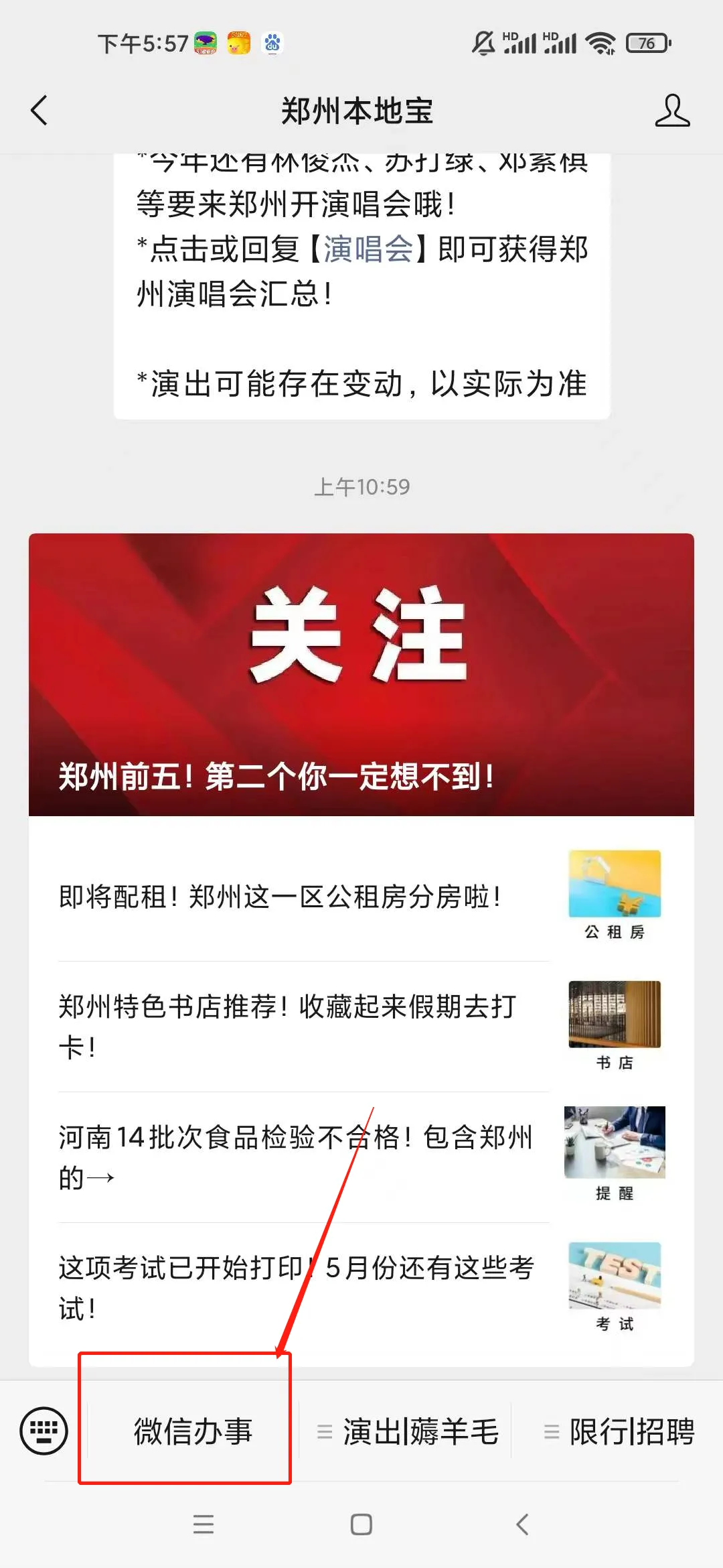➤可以在下方菜单栏点击微信办事,演出|薅羊毛,限行|招聘获取你想看的内容: