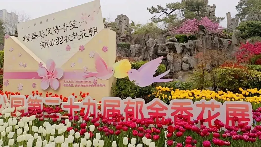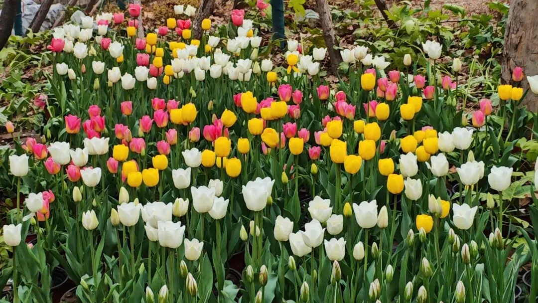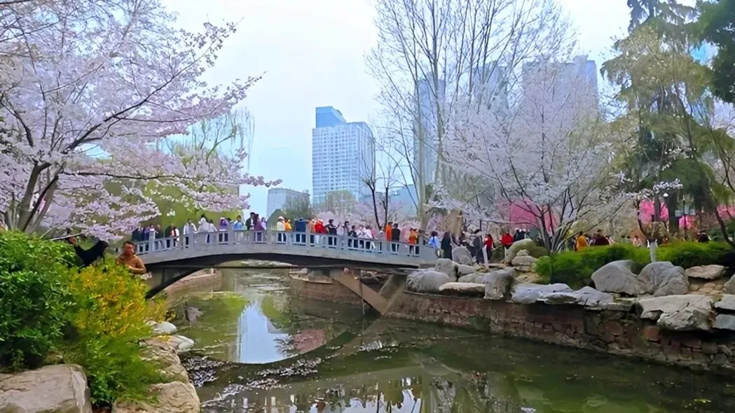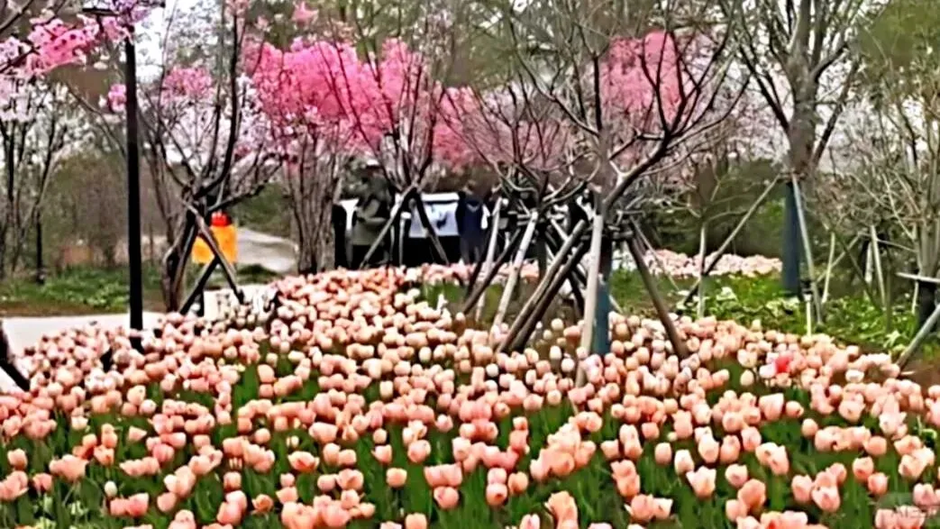 顺着樱花道往里走,拐过一座小石桥,眼前豁然开朗:一片郁金香像打翻的调色板,整整齐齐铺在草地上。红、黄、粉、紫,一畦一畦,颜色分明,却又相互呼应。樱花在高处轻轻摇,郁金香在低处静静立;一个飘,一个稳,却都把春天的气息推到你面前。游人停下来,蹲在花畦边拍照,镜头里既有高处的云,也有低处的霞,一张相片便把春天收全。在人民公园,抬头可见樱花的粉白,低头便是郁金片的斑斓。春天被它们分成两层,一层温柔,一层明亮,中间只隔着一条散步的小道,谁都能一步跨进这美好的春景里。