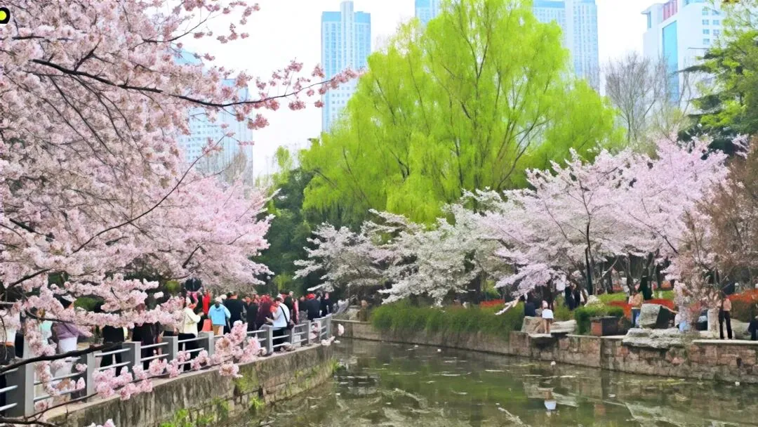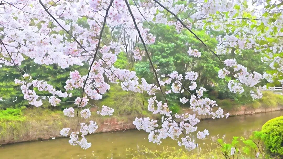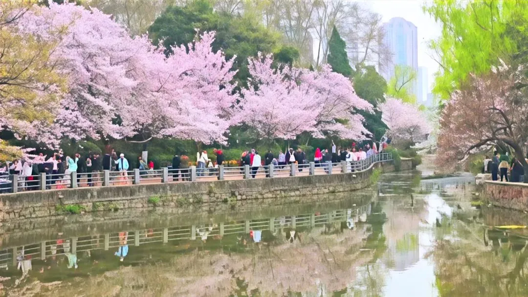 沿河的老樱花路上,人流熙来攘往。粉白枝头绵延成廊,一河倒影晃动着春色。北边桥上是最好的取景处:风过时,樱花簌簌;树下人影穿梭,仰头看花、低眉浅笑、按下快门——人与花,都入了镜。