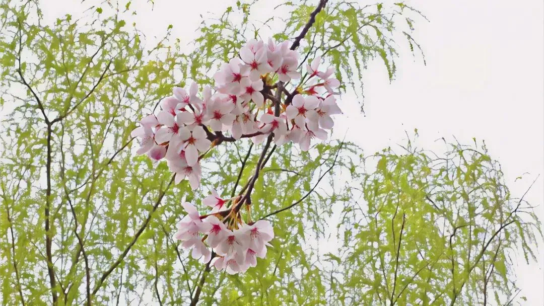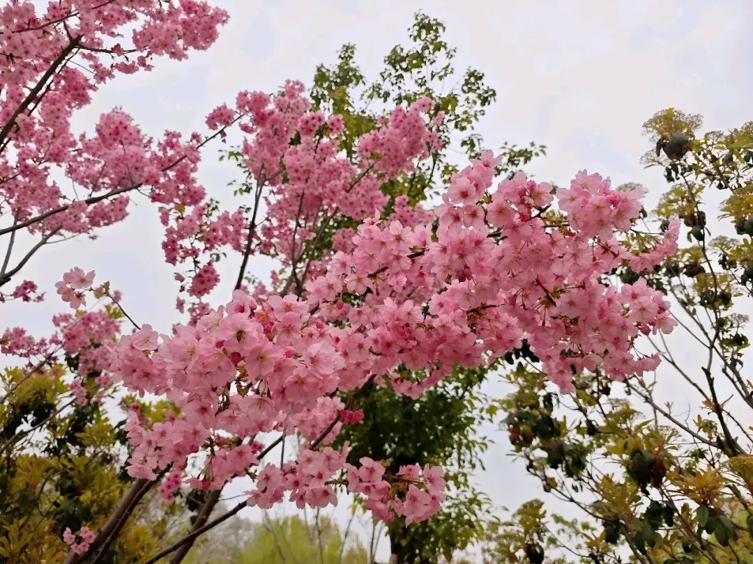 西门的樱花林也跟着呼应,像一片低低的云,风一吹就轻轻晃动。今年又多了一处新景:公园最南边新栽的樱花的树,树干只有胳膊粗,花却开得毫不怯场一样茂盛。