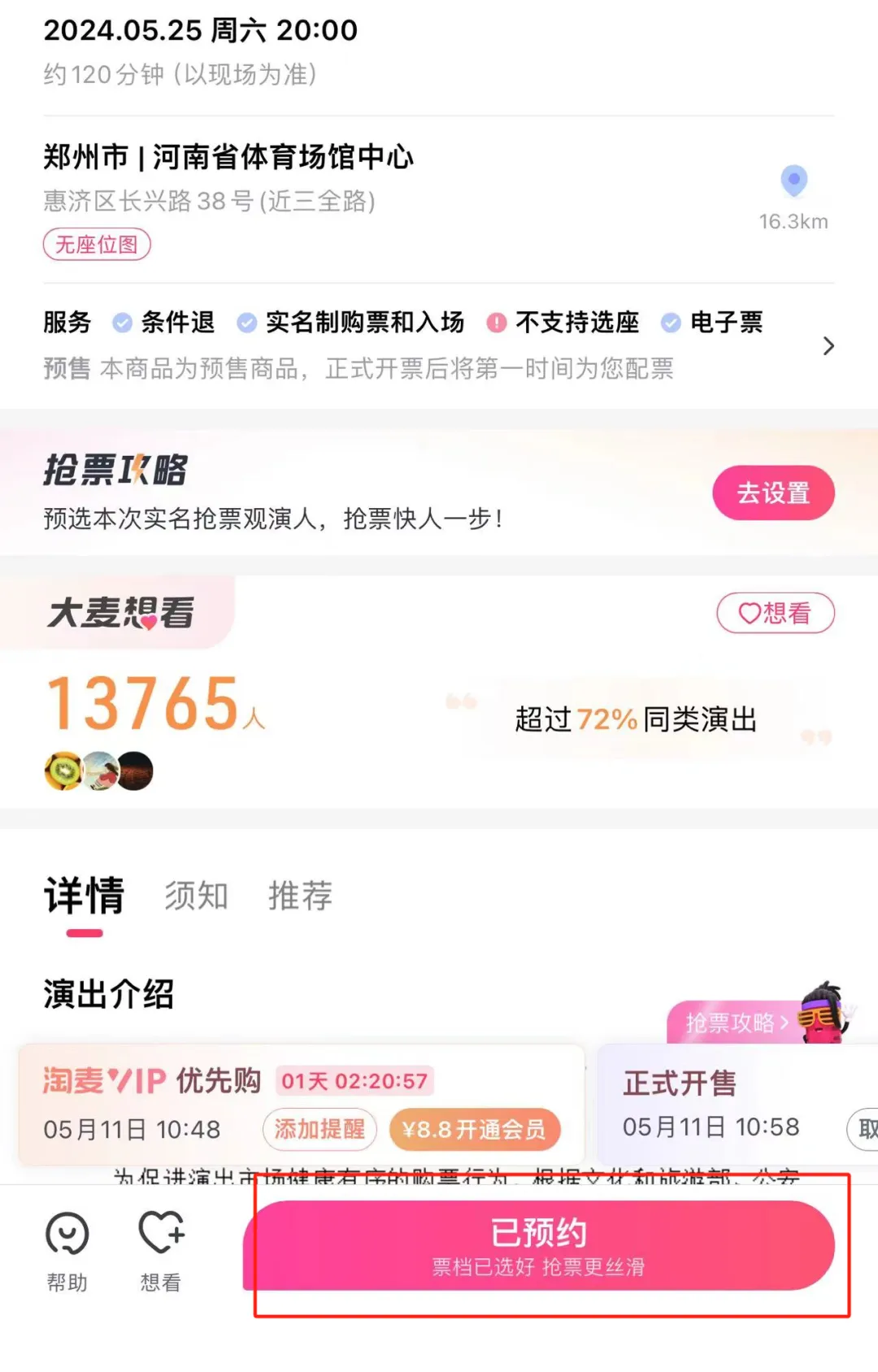 1、打开“大麦app”,搜索【恋曲】,选择【郑州·恋曲2024-我们在此相遇演唱会郑州站】,点击【预约抢票】