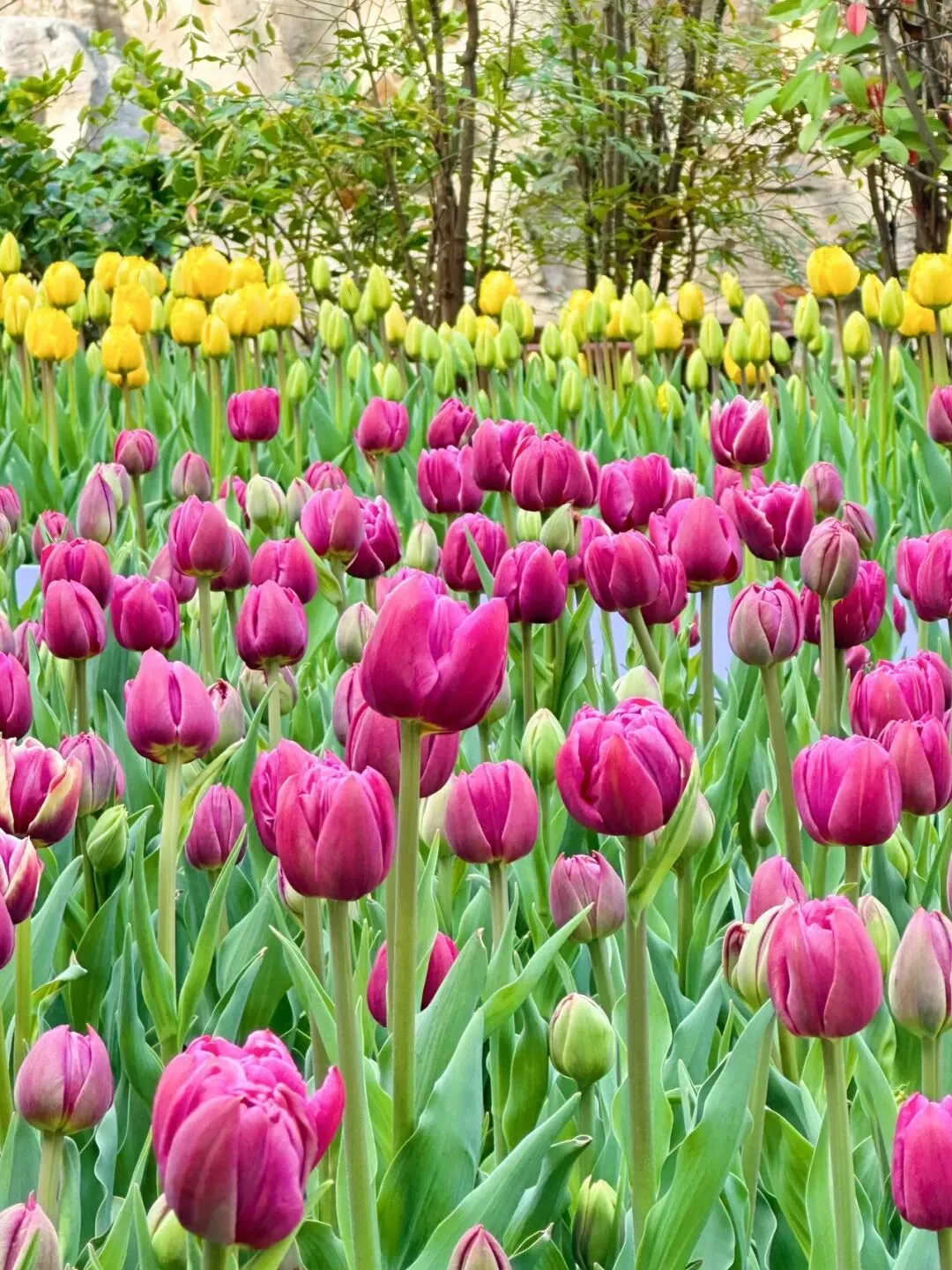 五颜六色的郁金香层层叠叠,红的热烈、粉的温柔、黄的明亮、紫的典雅,在阳光下开得肆意张扬,微风一吹,花浪轻轻起伏,连空气里都飘着淡淡的花香,漫步其中,仿佛一脚踏进了童话世界。