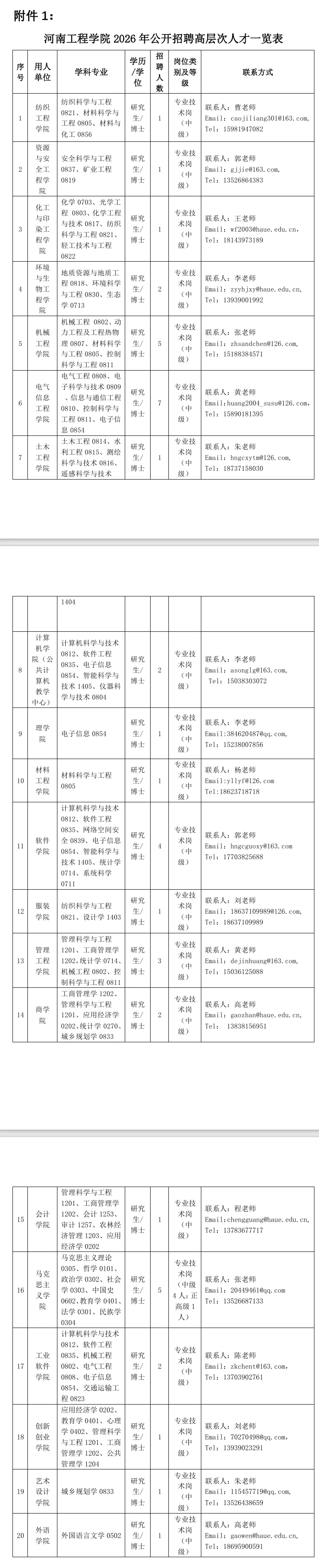 附件:1.河南工程学院2026年公开招聘高层次人才一览表