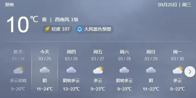 今天,郑州市将迎来今年首个25℃,今天起最高气温将连续7天稳定在20℃以上,其中,23℃两天,24℃两天,仅有3月30日为20℃。不过,昼夜温差较大,夜间依然寒冷。