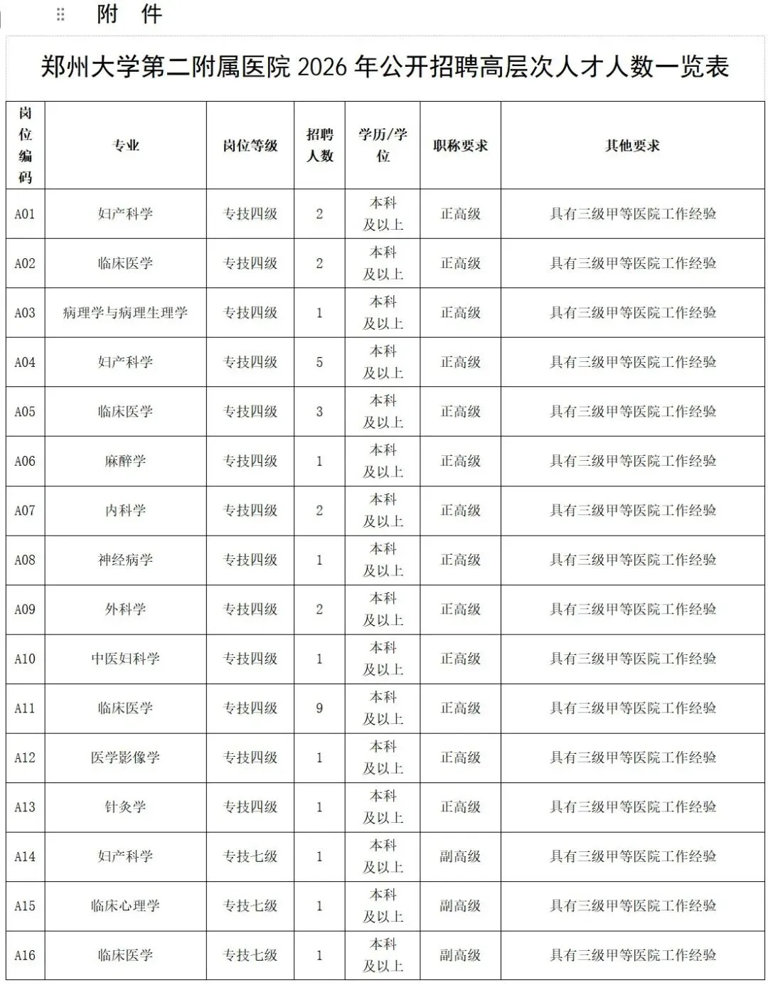 附件:郑州大学第二附属医院2026年公开招聘高层次人才人数一览表