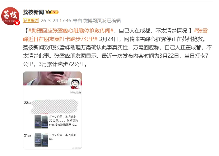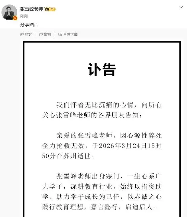 亲爱的张雪峰老师,因心源性猝死全力抢救无效,于2026年3月24日15时50分在苏州逝世。