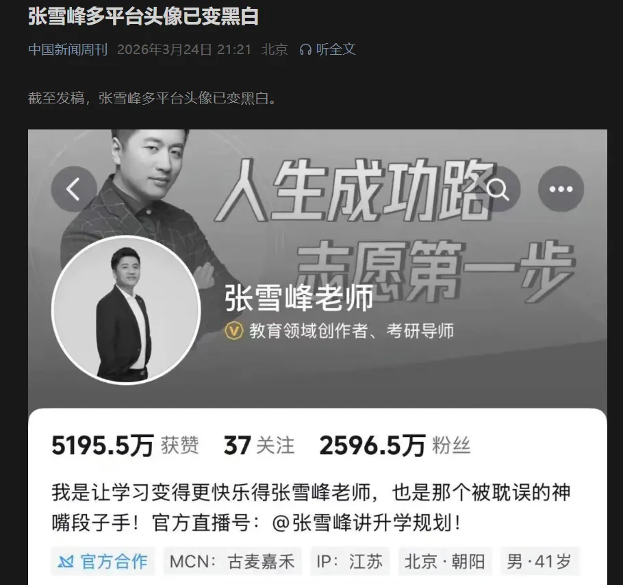 据中国新闻周刊报道(2026年3月24日21:21),截至发稿,张雪峰多平台头像已变黑白。