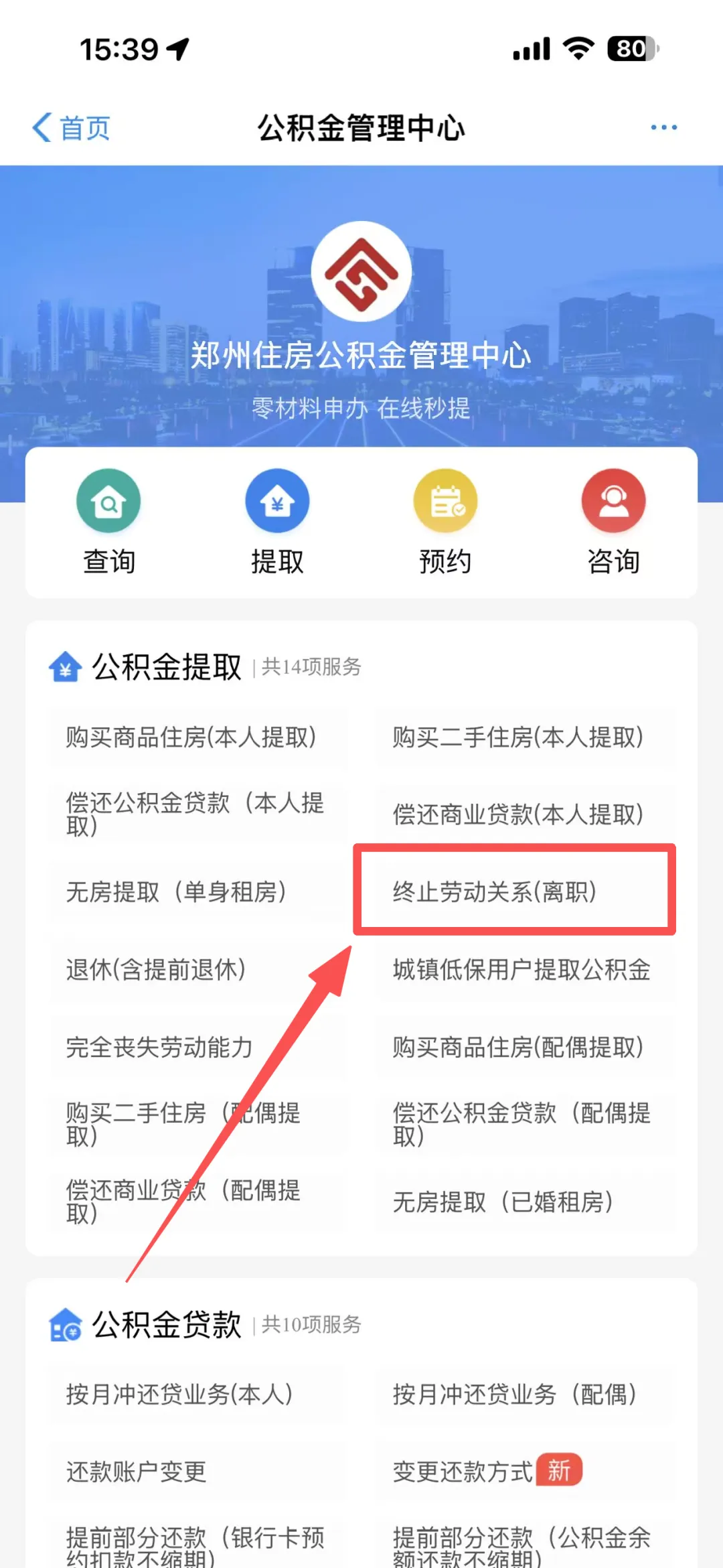 1️⃣在郑好办app主页点击【公积金】,进入后点击【终止劳动关系(离职)】