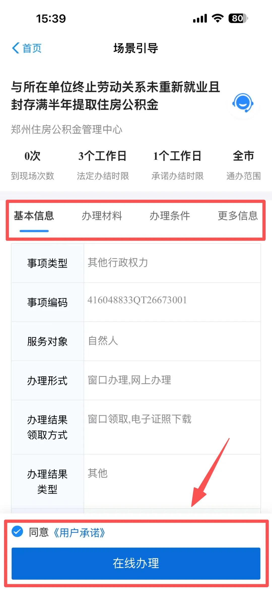 2️⃣进入后查看用户须知,勾选条款约定后,点击【确定】进入下一步,进入界面后也可以查看相关信息,点击【在线办理】即可进入办理流程界面