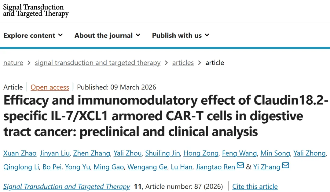 癌症在全球范围内仍是导致死亡的主要原因之一,尽管手术、放疗、化疗和靶向治疗等传统手段在过去几十年中一定程度上降低了死亡率,但临床效果仍存在局限,亟待创新方法突破困境。嵌合抗原受体T细胞(CAR-T)疗法通过将识别肿瘤表面抗原的单链可变片段导入T细胞,使其特异性攻击癌细胞,在血液肿瘤中已显示出潜力,然而在实体瘤如消化道癌中的应用受到肿瘤微环境抑制和CAR-T细胞功能不足的制约。郑州大学张毅等团队针对这一挑战,开发了针对Claudin18.2(CLDN18.2)的第四代CAR-T细胞,该细胞同时分泌白细胞介素-7(IL-7)和趋化因子XCL1,被命名为ExCAR-T细胞(在临床试验中称为RD07细胞)。这项研究旨在通过增强CAR-T细胞的持久性和免疫激活能力,改善对消化道癌的治疗效果。相关成果于2026年3月9日发表在《Signal Transduction and Targeted Therapy》期刊上,论文标题为“Efficacy and immunomodulatory effect of Claudin18.2-specific IL-7/XCL1 armed CAR-T cells in digestive tract cancer: preclinical and clinical analysis”。该工作从基础研究延伸至临床验证,为消化道癌患者提供了新的治疗思路。