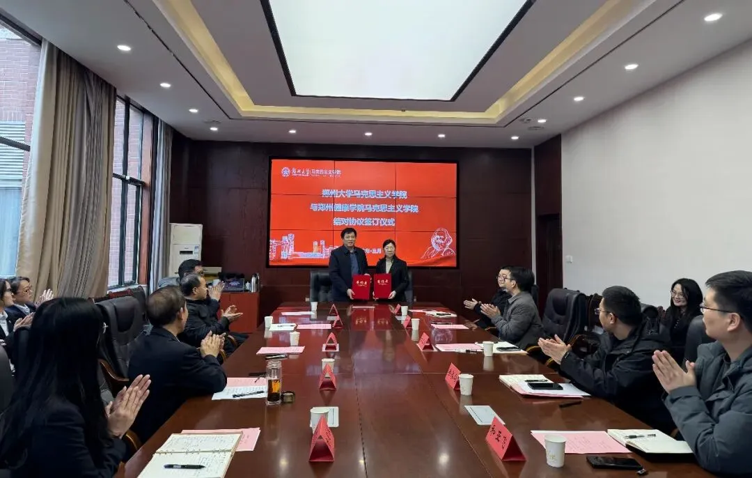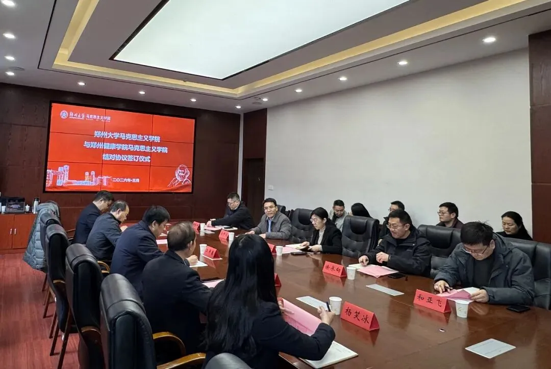 3 月 18 日下午,郑州健康学院马克思主义学院结对帮扶交流座谈暨协议签订仪式在郑州大学顺利举行。郑州健康学院党委副书记江开春,郑州大学学术副校长、马克思主义学院院长刘吕红出席仪式,双方相关负责人及教师代表参加活动,仪式由郑州大学马克思主义学院副院长任中义主持。此次结对帮扶协议的签订,标志着两校马克思主义学院校际合作迈入制度化、常态化新阶段,为携手推动思政教育内涵式发展、提升思政课建设质量搭建了坚实平台。