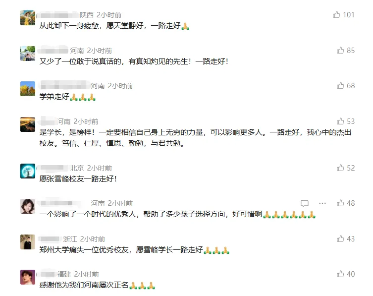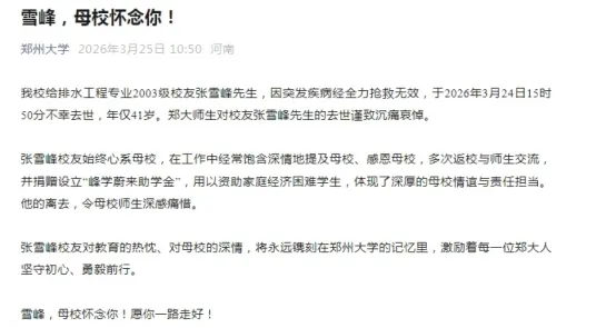 斯人已逝,精神长存。张雪峰校友对教育的热忱、对母校的深情,将永远镌刻在郑州大学的记忆里,激励着每一位郑大人坚守初心、勇担使命。愿张雪峰校友一路走好!
