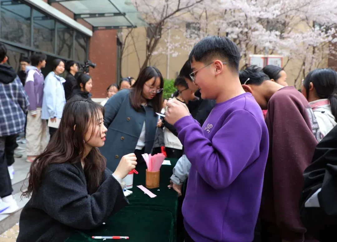 在“樱知多少·知识问答”“樱探玄机·成语竞猜”“樱诗令·飞花令”等点位,同学们踊跃参与,在文学常识、诗词对韵与成语谜题中感受传统文化的魅力。“樱音绕梁·汉语绕口令”挑战锤炼语言表达,而“樱才挑战·英汉互译”则展现双语风采,吸引众多学子争相闯关。