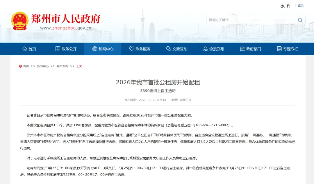 3月24日,记者从郑州市住房保障和房地产管理局获悉,根据相关要求并结合全市供需情况,该局发布2026年郑州市第一批公租房配租方案。