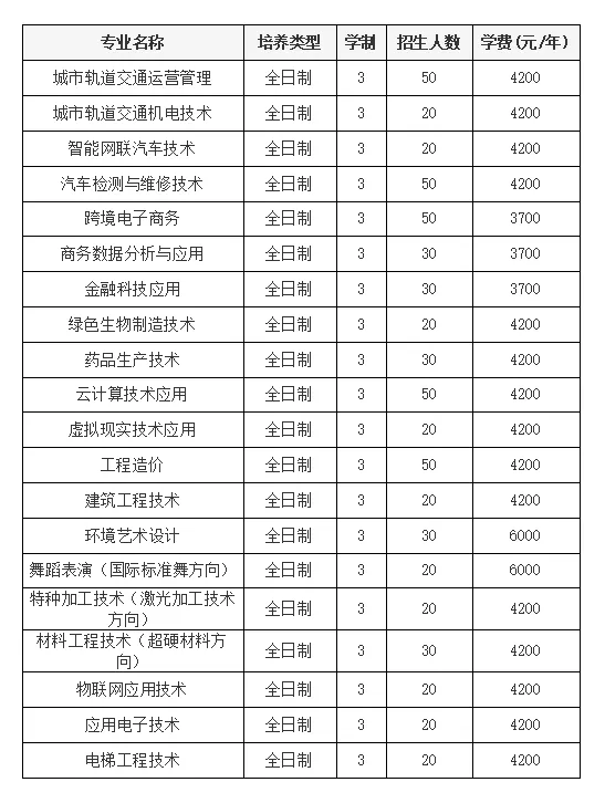 学校单招专业有:城市轨道交通运营管理、城市轨道交通机电技术、智能网联汽车技术、汽车检测与维修技术、跨境电子商务、商务数据分析与应用等共计二十个专业,高职单招计划总计600人。