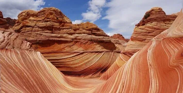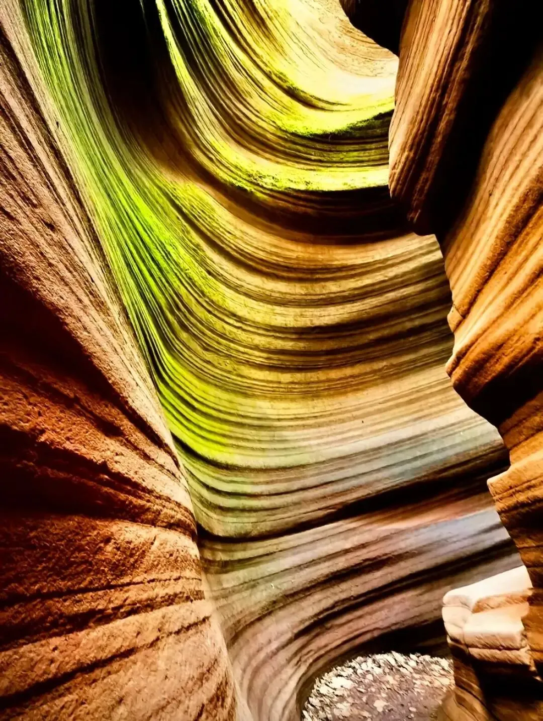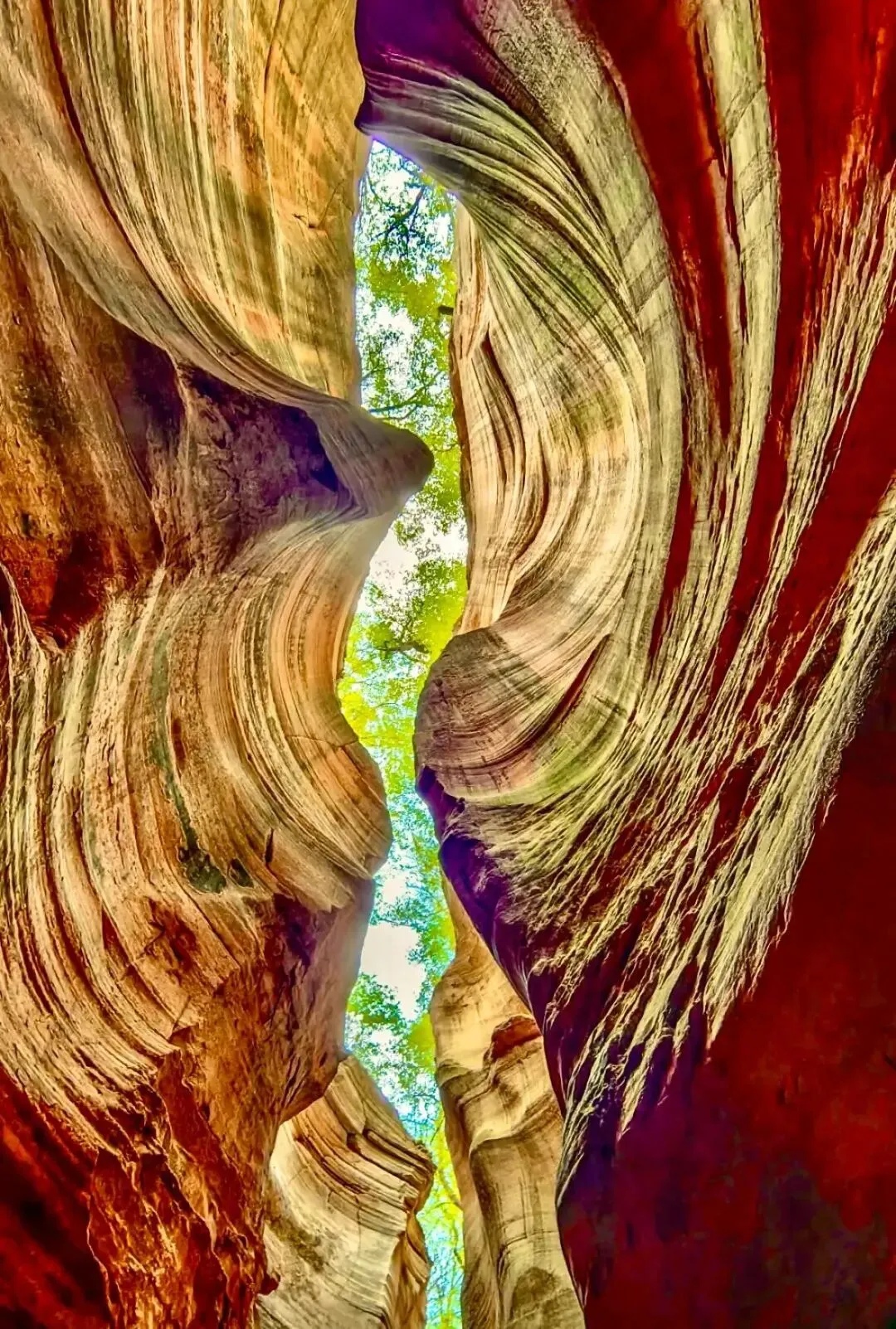 亿万年前的地震,让红色的砂岩裂开了一道缝隙,经过千百年流水的冲刷与雕琢,形成了这处梦幻的峡谷秘境。阳光穿过狭窄的谷壁,在红色的岩石上投下流动的光影,随着脚步移动,光影不停变换,时而金黄,时而赤红,像大地打翻了调色盘,堪称“流动的光影美术馆”。行走在峡谷中,仿佛穿梭在时光的隧道里,每一步,都是不一样的惊喜。