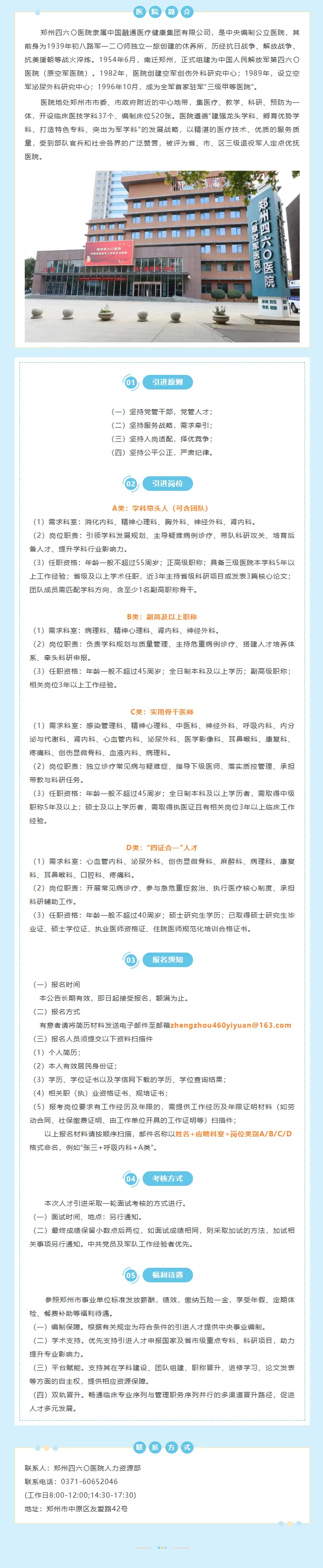 【河南郑州】郑州四六〇医院招聘公告(消化、精神、胸外、神经外、肾内、病理、中医、呼吸、内分泌、心血管、影像、耳鼻喉、康复、血液)