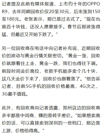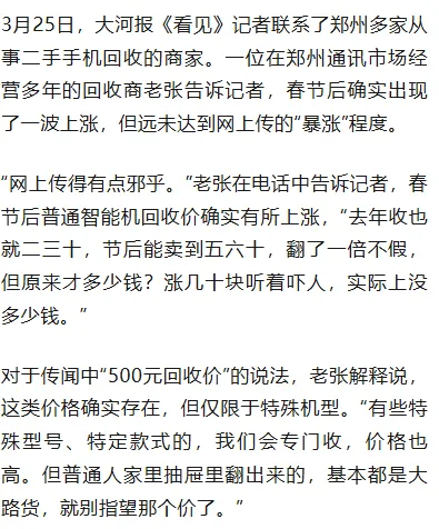 3月25日,大河报《看见》记者从郑州二手手机回收市场了解到,回收价格确有上涨,但远未达到“暴涨”程度,普通机型涨幅有限,数百元回收价仅限于特殊款式手机。而春节后经历一波上涨后,近期行情又出现回落。