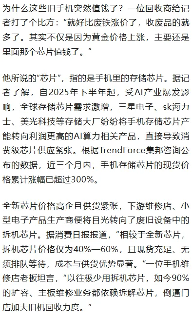 近期,受存储芯片涨价影响,废旧手机回收价格出现数倍涨幅的消息引发关注。有报道称,曾经只值10元的二手机如今回收价可达数百元,“3部旧手机就可以换一台iPhone”。真相如何?
