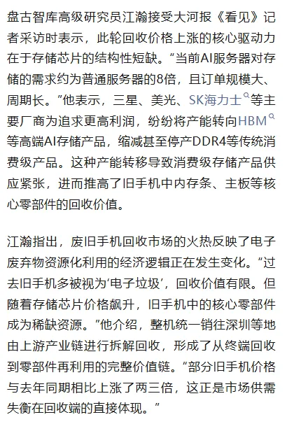 专家观点:存储芯片结构性短缺推高回收价,消费者需警惕隐私风险