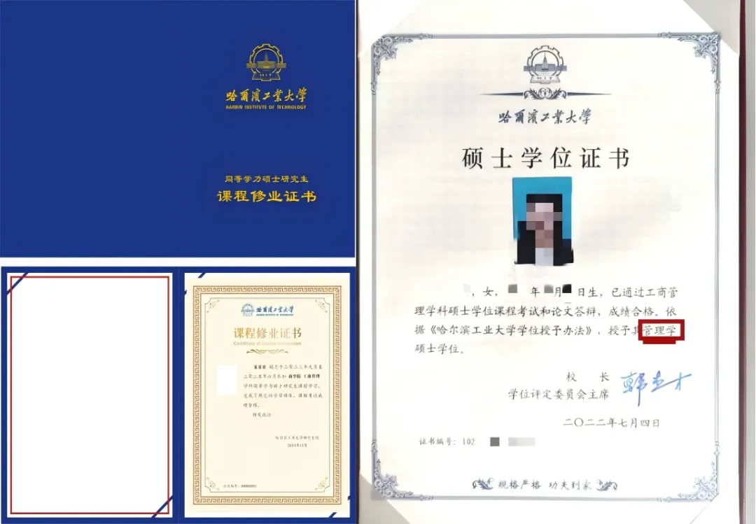 1.学位权威:证书由哈工大颁发,样式、编号及防伪与全日制完全一致(如下图),无“同等学力”标注。学信网终身可查,法律效力同等,畅通晋升、评职与深造通道。