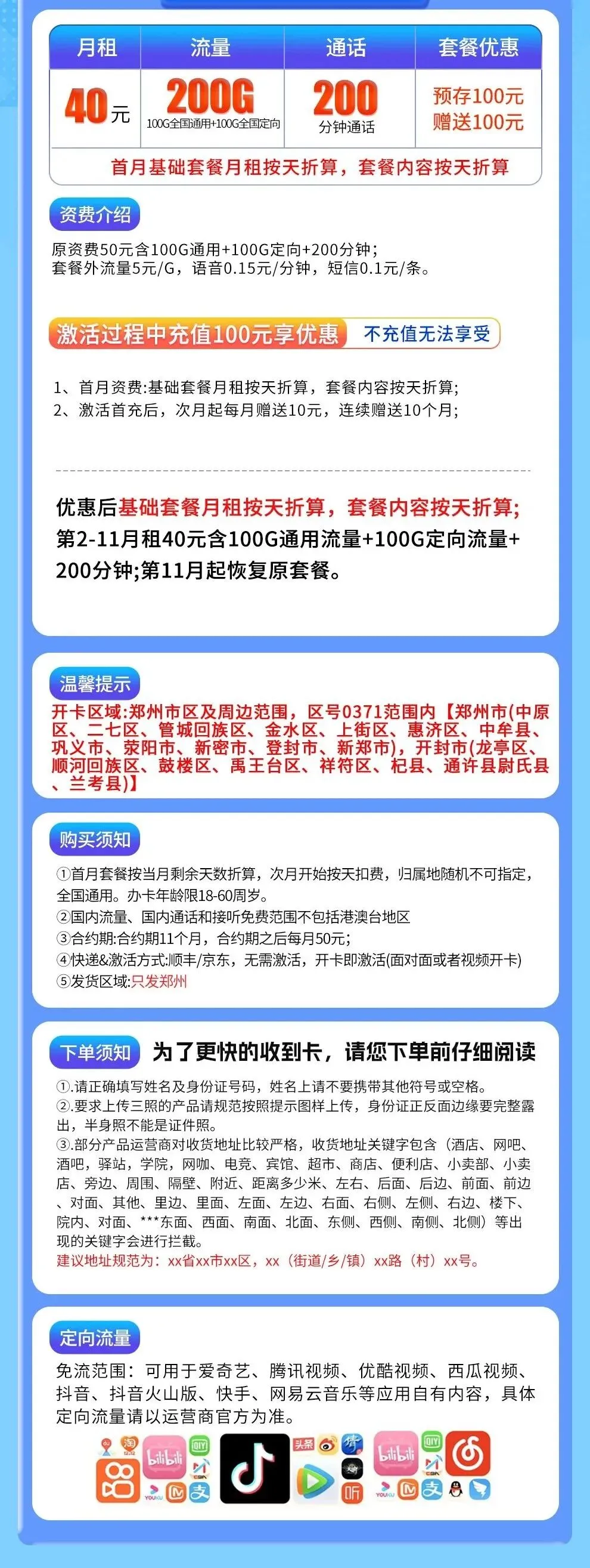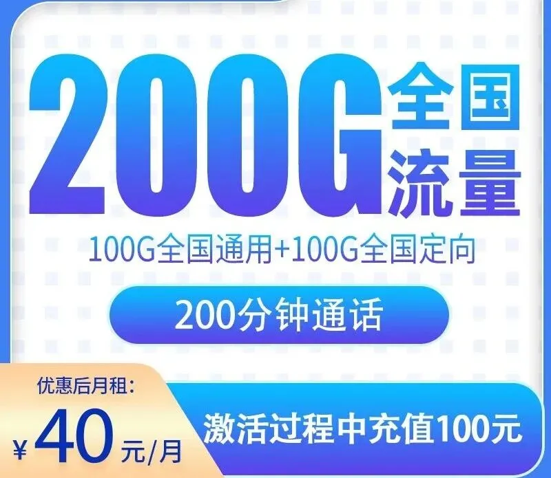 第2-11月租40元含100G通用流量+100G定向流量+200分钟;