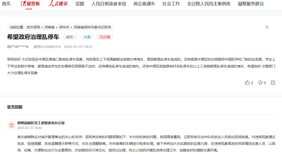 >人民网领导留言板:希望郑州市政府治理乱停车