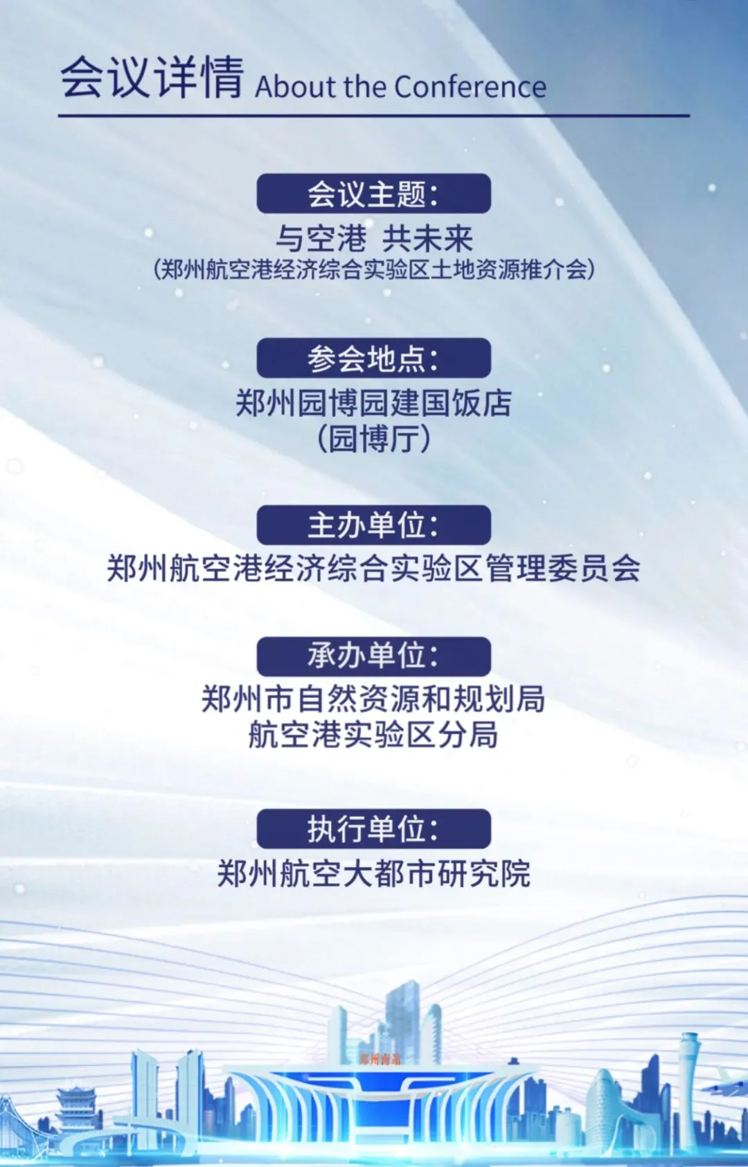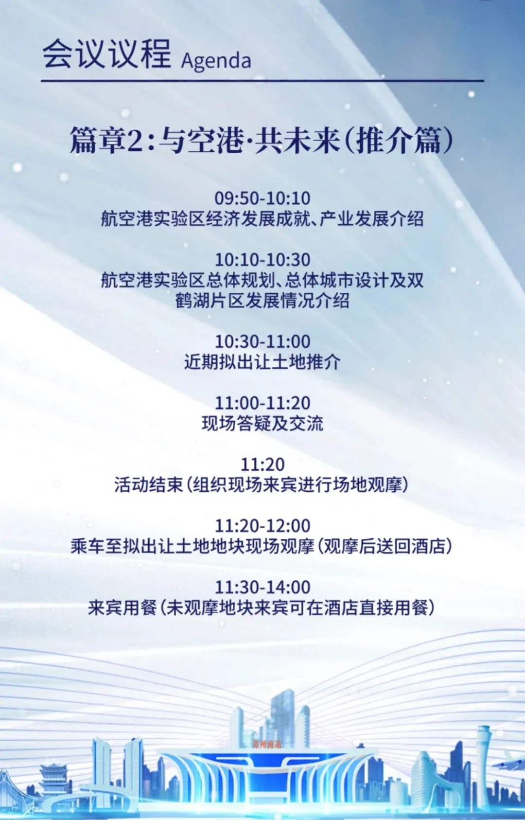 为推动经济快速发展,发挥航空港区在促进中部地区崛起、构建“双循环”新发展格局中的重要支撑作用,推动区域发展再上新台阶,航空港区拟于2021年7月15日,在郑州园博园建国饭店举行“与空港 共未来”土地资源推介会,邀请全国房地产开发企业、投资商代表共聚河南,传递郑州航空港区开放合作的气息,携手所有来宾共谋合作发展、共建理想空港、共赴国际美好航空新城。本次推介会涉及拟出让土地16宗,均位于双鹤湖科技城核心板块区域,分两期出让,一期出让8宗土地范围:东至规划生物科技四街、西至雍州路、南至东海路、北至公园南一路;二期出让8宗土地范围:东至规划生物科技四街、西至雍州路、南至公园北一路、北至志洋路。