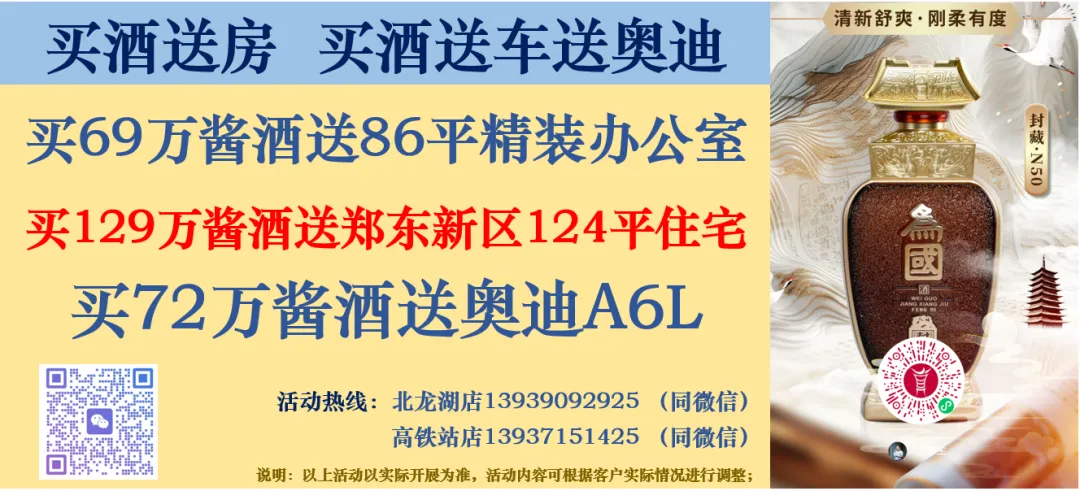 (1)买69万酱酒送高新区新芒果84平精装办公室:办公性质,精装修,三室一厅(双层),可住宿,有房产证;(2)买129万酱酒送郑东新区宽景一口124平毛坯住宅;
