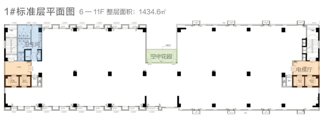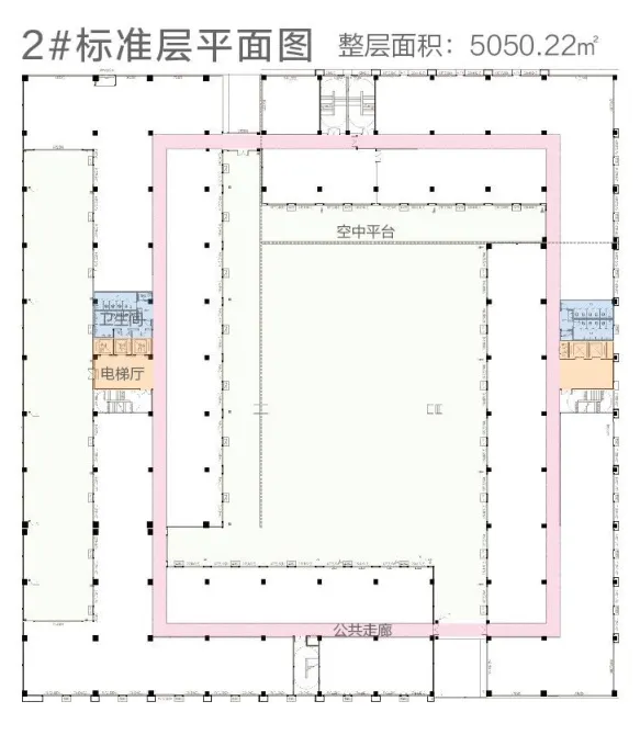 2#楼(5F):4-5层可租(标准层5050.22㎡,层高3.8m,5部电梯);11米挑高大堂、L型布局,360°环幕视野,8.1m/10.3m阔绰柱距,空中平台会客厅/花园,空间可灵动分割。