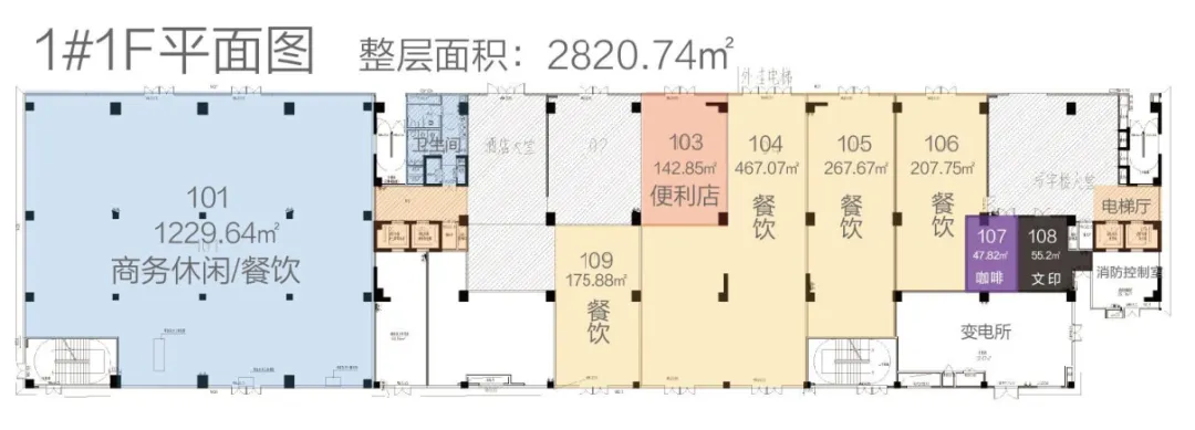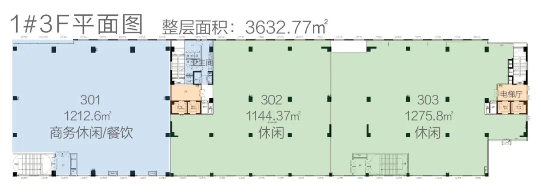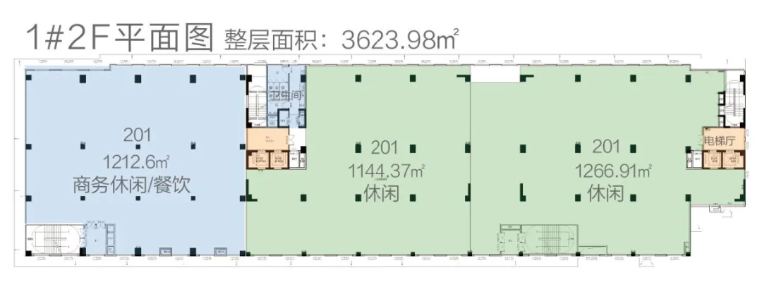 1#楼(15F):10-15层为知名酒店;4-10层空置(标准层1434.6㎡,层高3.6m,4部电梯);1-3层可做汽车展厅、运动场馆、主题餐饮等商业(1层2820.74㎡,层高5.4m;2层3623.98㎡、3层3632.77㎡,层高均4.5m)。