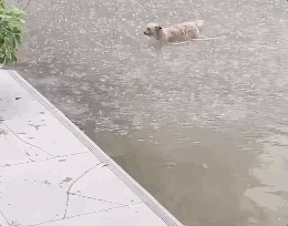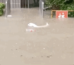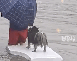 这位主人,打着伞在洪水中艰难前进,而在他的腿边,有一个小家伙紧紧地贴着,看得出狗狗有些害怕,但是只要有主人在,它一定会安心很多。