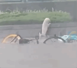 还有下面这位主人,他怀里抱着一只狗狗艰难前行,还不忘回头招呼另外两只狗狗,指挥它们一起去往安全地带。他说:什么都可以丢,但我的狗狗不能丢下…