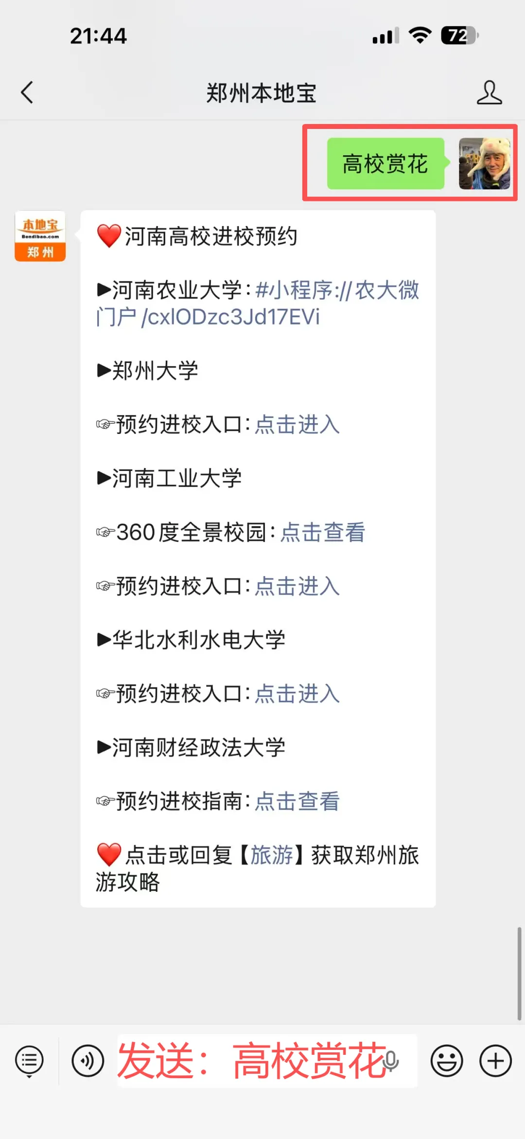 ✅河南工业大学预约登记入口:访客预约系统,也可以进入【郑州本地宝】公众号,对话框回复【高校赏花】,即可获取预约登记入口