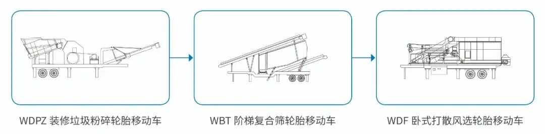 郑州鼎盛开发的移动式无人分拣装修垃圾处置设备系列——包括WDPZ装修垃圾粉碎轮胎移动车、WBT阶梯复合筛轮胎移动车和WDF卧式打散风选轮胎移动车——凝聚了装备研发人员的巨大心血,能够满足装修垃圾处置项目中建设周期短、投资少、占地面积小、可快速转场且无需固定场地等多种核心需求。