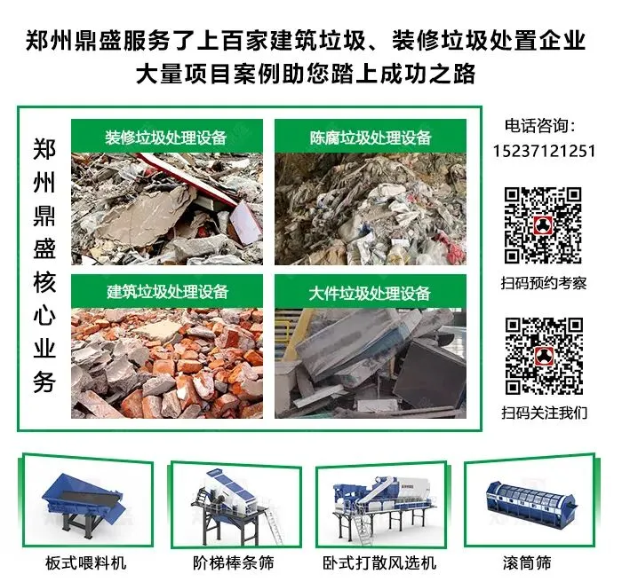 郑州鼎盛作为固废处理领域的专业设备制造商,长期致力于建筑垃圾、装修垃圾、大件垃圾及陈腐垃圾等物料的智能化处置装备研发。自主研发的中型板式给料机、阶梯棒条筛、驰张复合筛、卧式打散风选机、滚筒筛等系列产品,在装修垃圾分拣领域展现出卓越性能。尤其在轻杂质分选设备的研发制造方面取得了突破性进展。