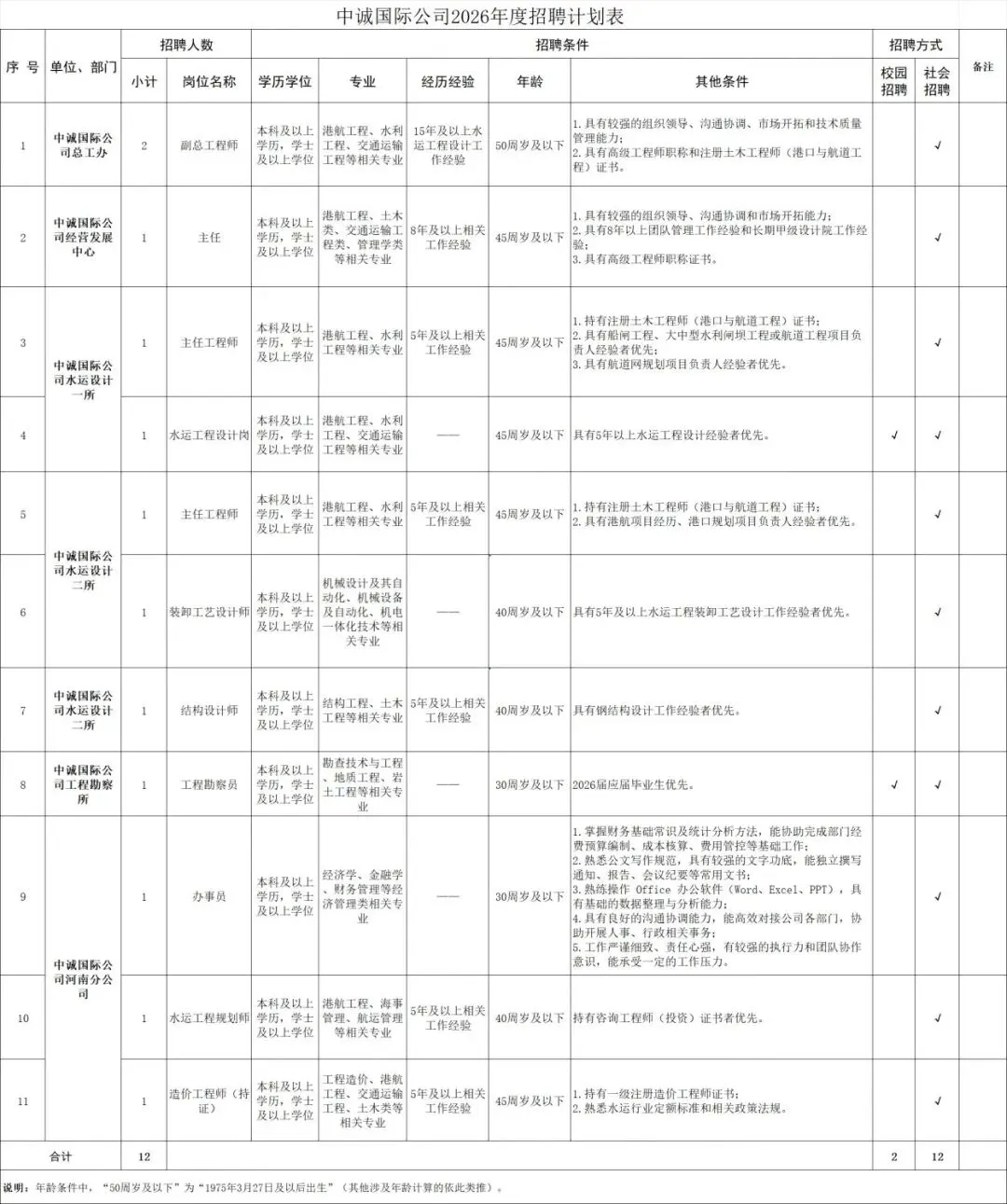 副总工程师2人;经营发展中心主任1人;水运设计一所主任工程师1人、水运工程设计岗1人;水运设计二所主任工程师1人、装卸工艺设计师1人、结构设计师1人;工程勘察所工程勘察员1人;河南分公司:办事员1人、水运工程规划师1人、造价工程师(持证)1人。共计12人。