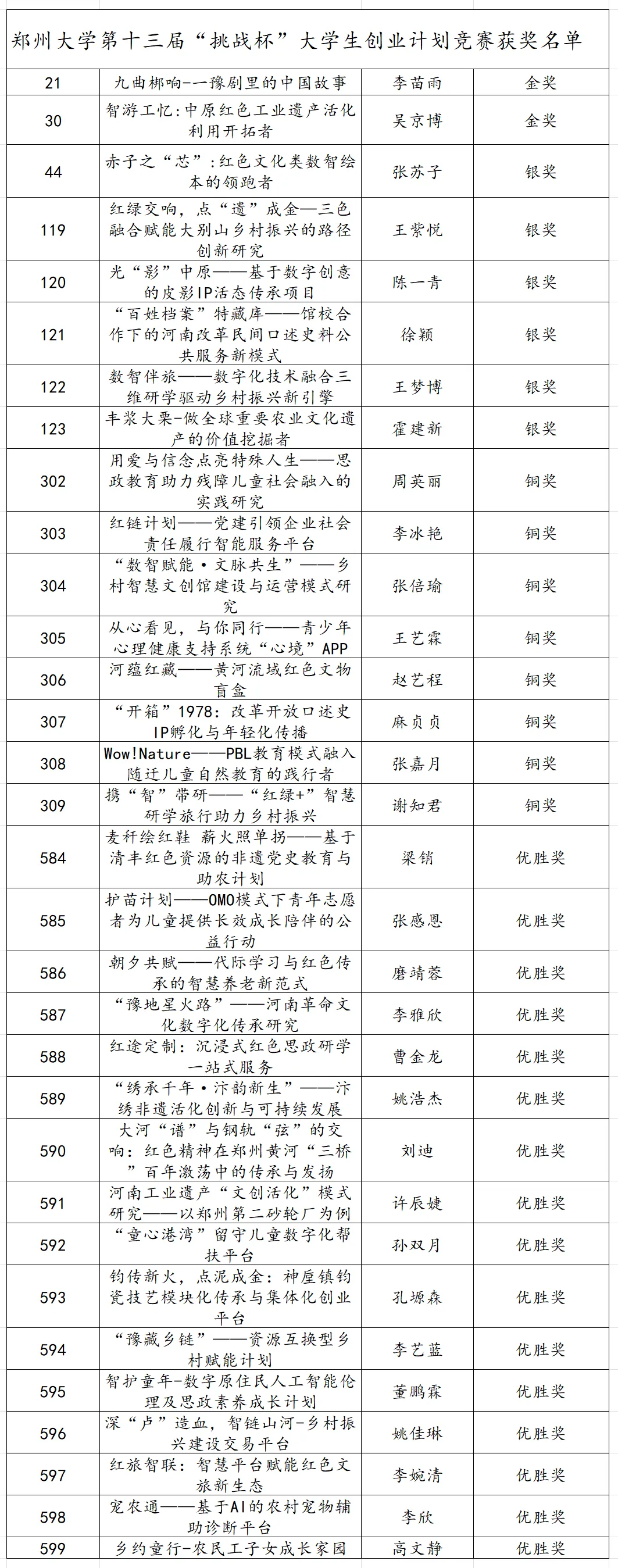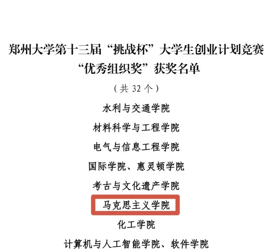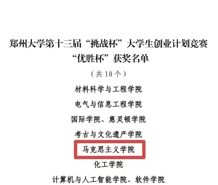 近日,郑州大学第十三届“挑战杯”大学生创业计划竞赛终审决赛结果正式公布。学院荣获“优胜杯”和“优秀组织奖”,并在参赛项目中喜获校级金奖2项,彰显出学院在创新创业氛围营造和青年人才培养方面的扎实成效。