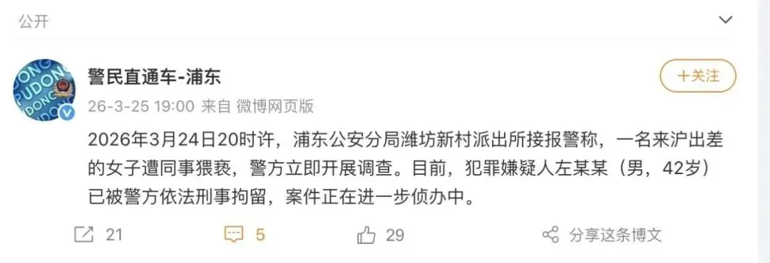 3月25日,信达证券研究所所长左前明被女下属实名举报,在上海出差期间实施猥亵行为,警方最新通报:犯罪嫌疑人左某某(男,42岁)已被依法刑事拘留。(南方都市报、上海市公安局浦东分局)