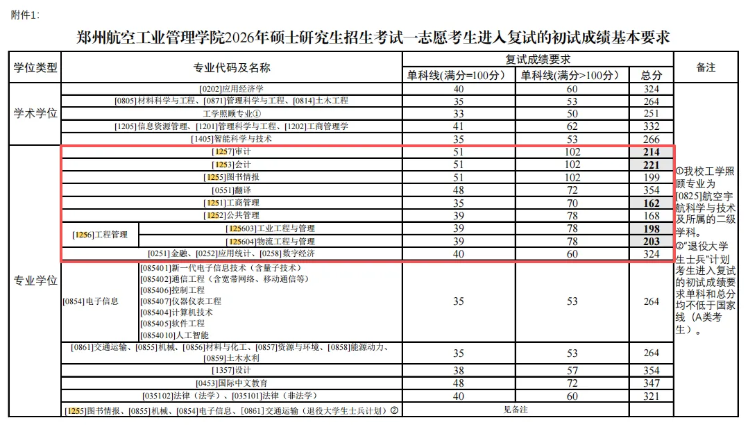 郑州航空工业管理学院2026年硕士研究生招生考试一志愿考生进入复试的初试成绩基本要求