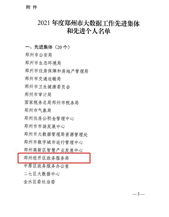 日前,郑州市人力资源和社会保障局、郑州市大数据管理局对2021年度在郑州市大数据工作中涌现出来的20个先进工作集体和60名先进个人予以表彰。经开区榜上有名。