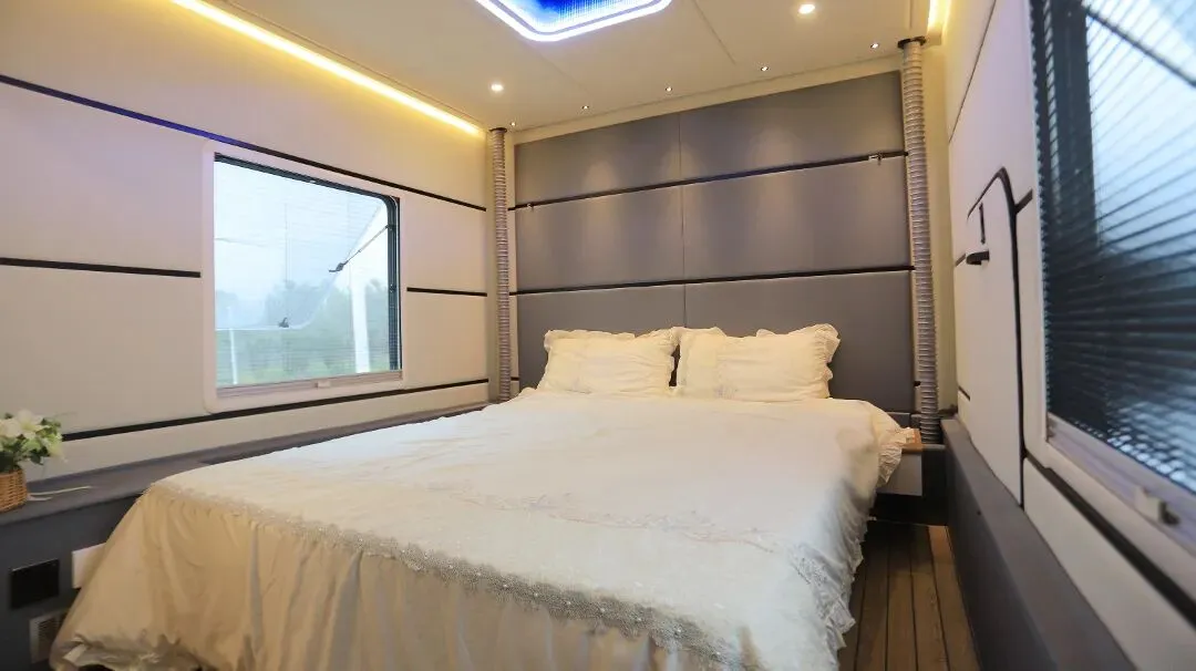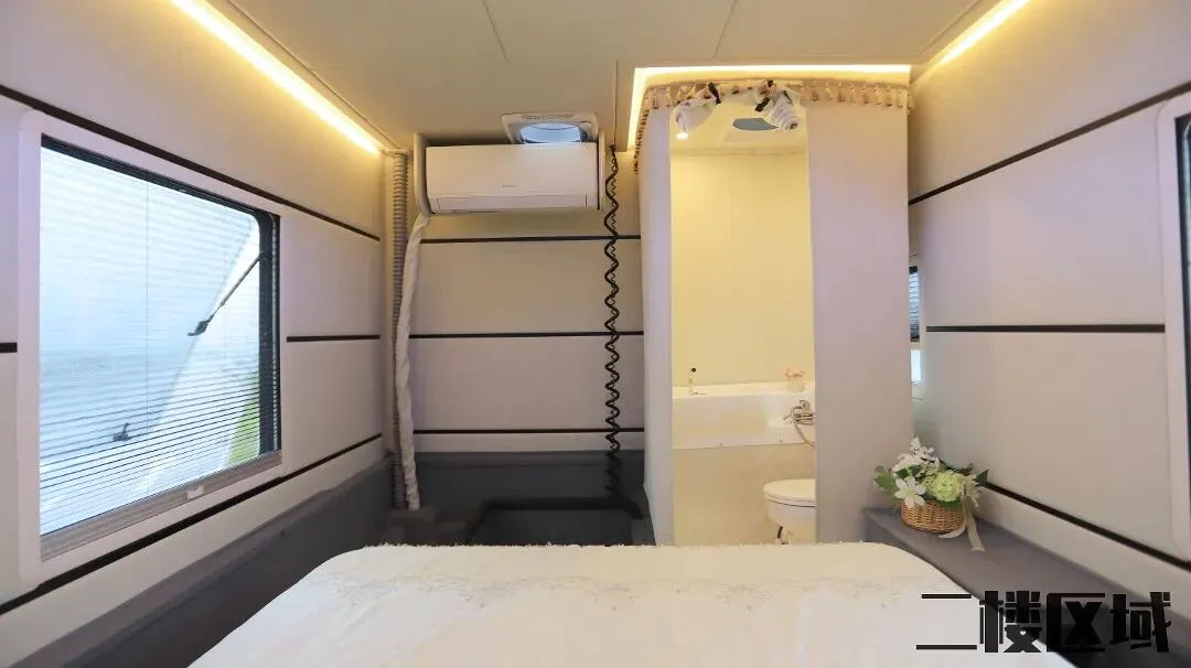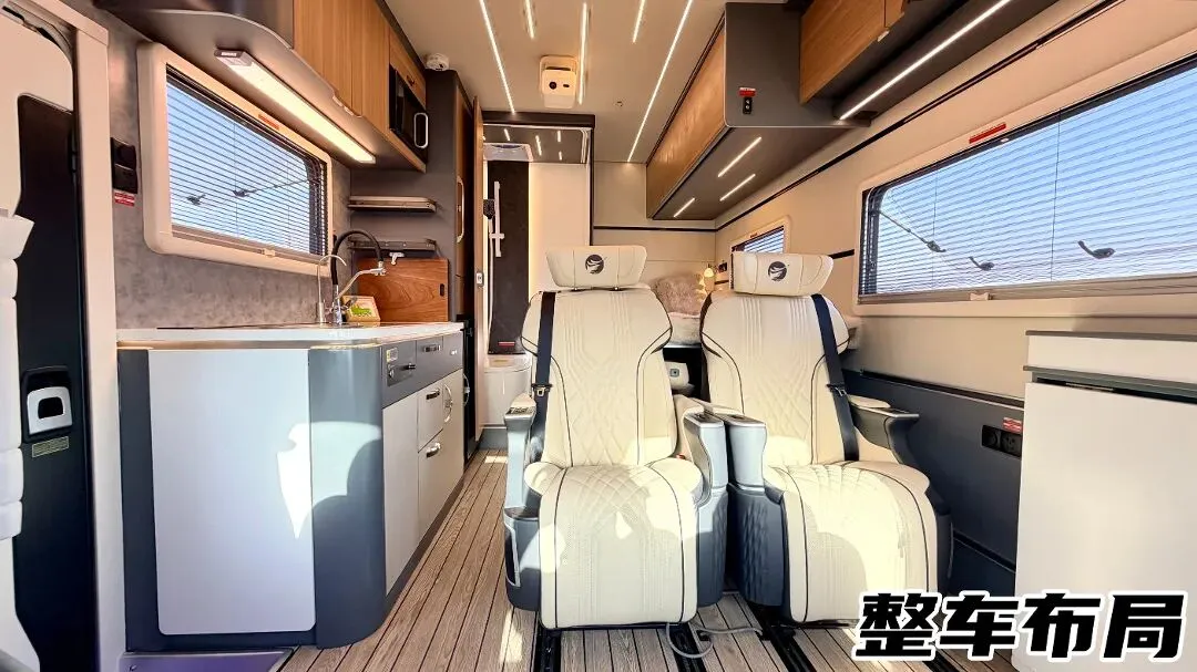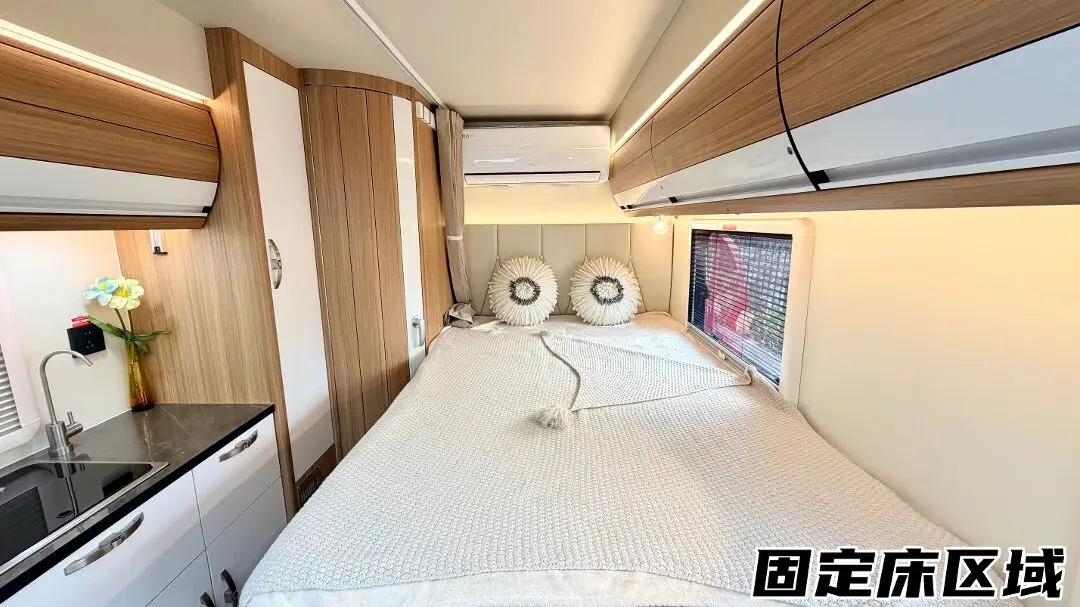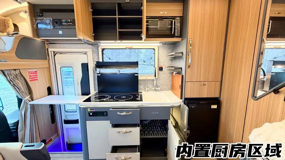 车内配置直接拉满,一层拥有1.9米舒适净高,1.4×2.2米额头床、航空座椅会客区、双炉灶厨房、一应俱全;二层独立主卧搭配专属卫生间,48V电路系统加持,水电无忧,让旅居生活和在家一样自在便捷,轻松实现“移动小家”的梦想。