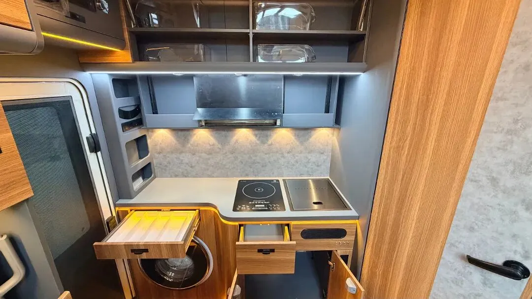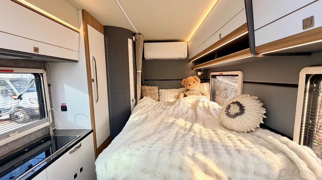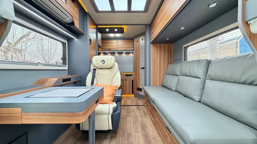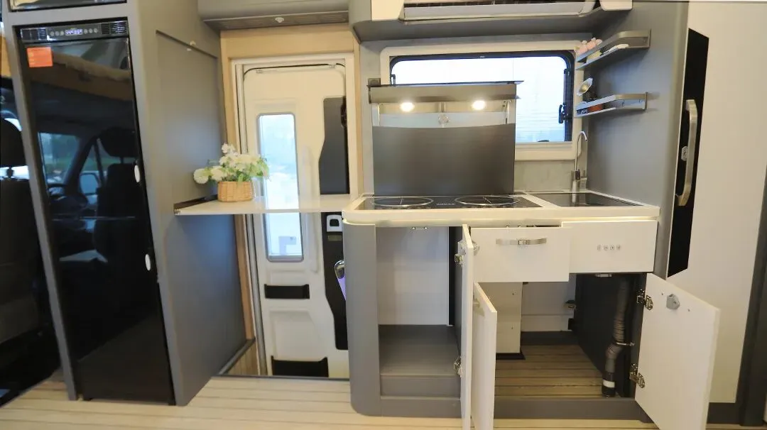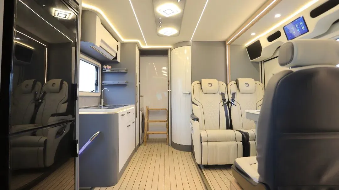 车内配置直接拉满,一层拥有1.9米舒适净高,1.4×2.2米额头床、航空座椅会客区、双炉灶厨房、一应俱全;二层独立主卧搭配专属卫生间,48V电路系统加持,水电无忧,让旅居生活和在家一样自在便捷,轻松实现“移动小家”的梦想。